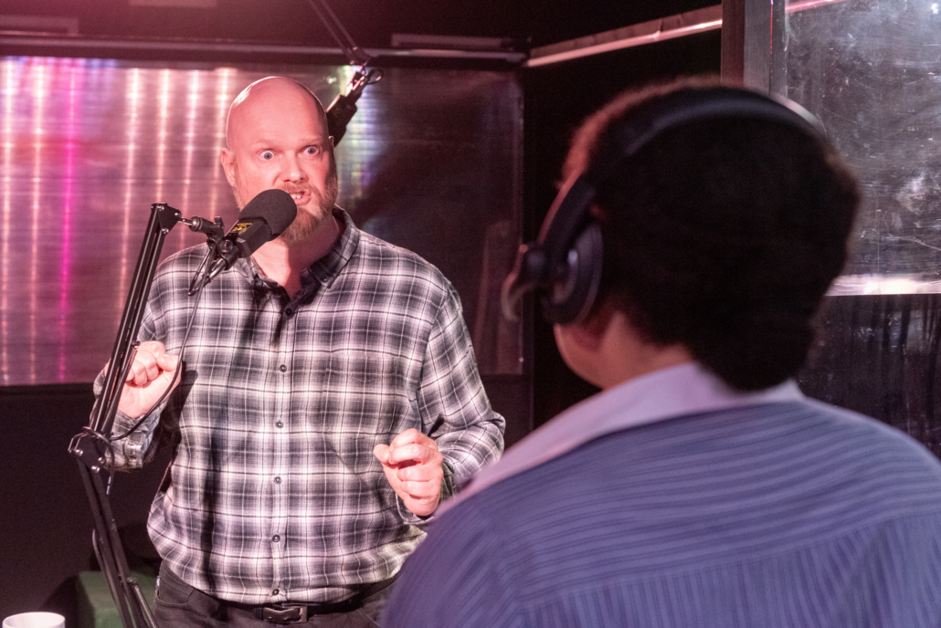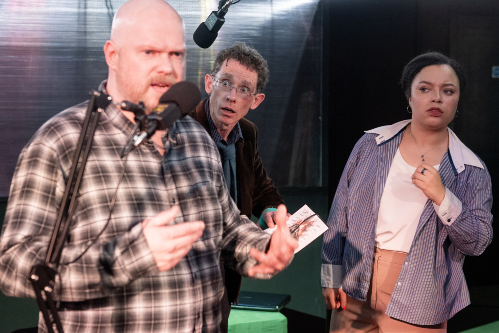 Setting a play in a tiny basement radio station is not without its challenges. The cast is trapped inside a radio booth. Much of the events outside are heard and never seen. Our adventurous cast and creative teams have made finding the solutions a joy, balancing practicality with the often surreal events of the play. Thanks must go to my Stage Manager, Giles Allen-Bowden, for coordinating many spinning plates.